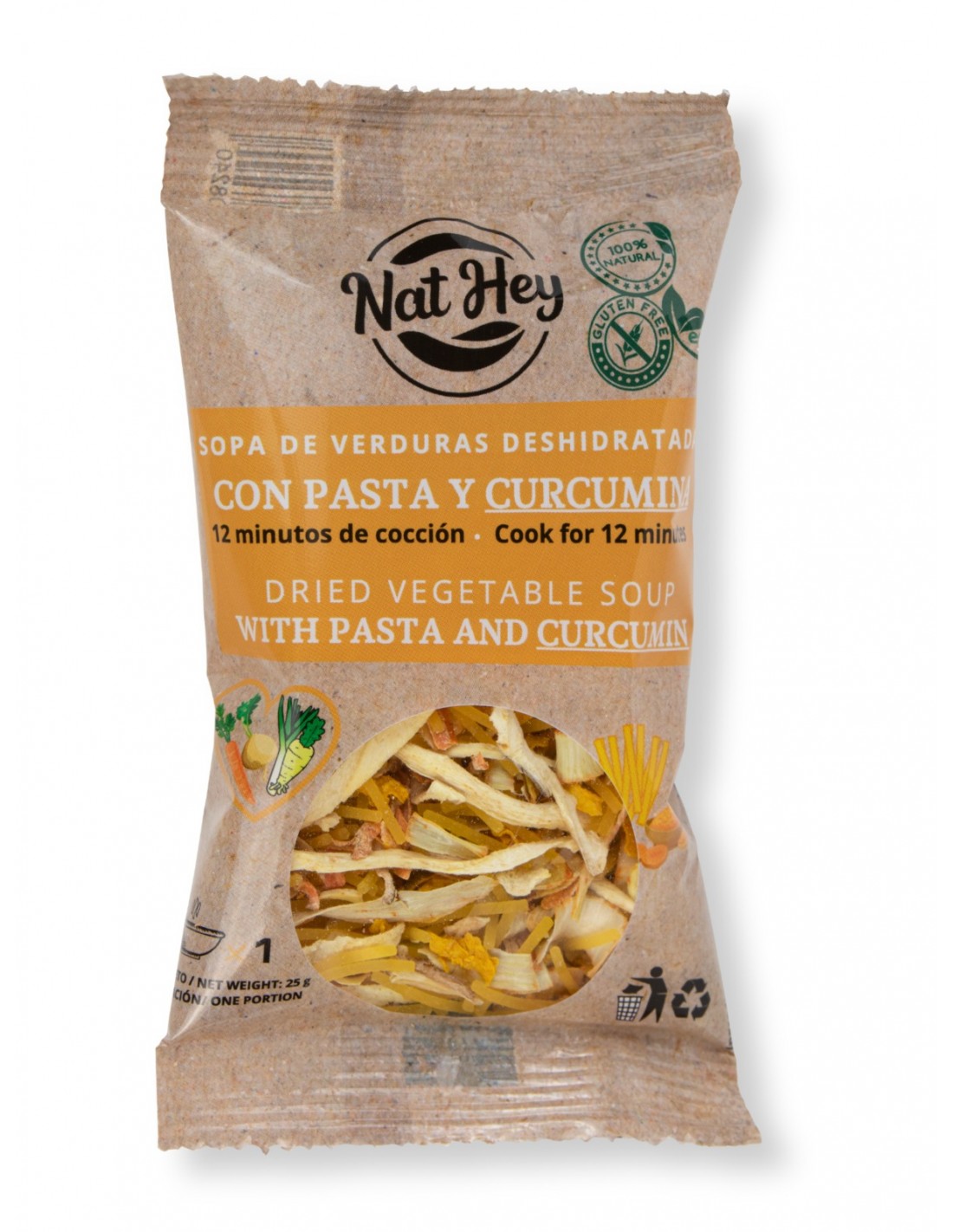 Pasta de harina de maíz y arroz, zanahoria, puerro, chirivía, nabicol, pimentón y curcurina.