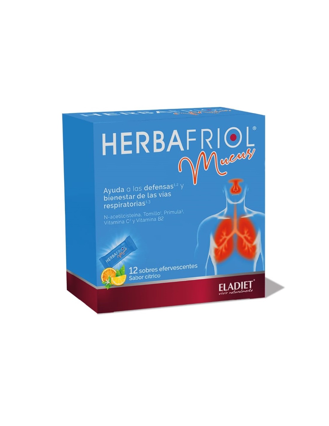 Fructosa; Corrector de la acidez: Ácido cítrico; Estabilizante: Carbonato ácido de sodio; N-acetilcisteína; Extracto seco de hoja de tomillo (Thymus vulgaris L.); Extracto seco de raíz de prímula (Primula veris L.), Aroma de naranja; Ácido ascórbico (Vitamina C); Aroma de limón; Educorante: Sucralosa; Riboflavina (Vitamina B2).