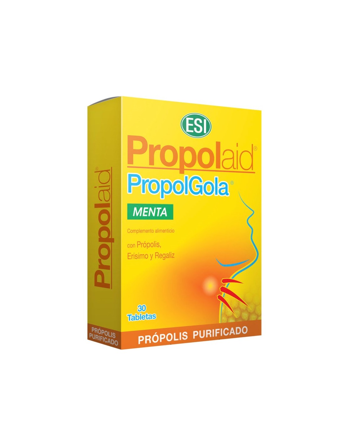 Propolaid PropolGola sabor menta ESI 30 tabletas. Complemento alimenticio formulado con sustancias de acción sinérgica como el Própolis, la Regaliz, el Erísimo y la Menta, que le dan al producto un sabor fuerte y agradable. El própolis en forma de extracto seco con una titulación del 12% en galangina (flavonoide).