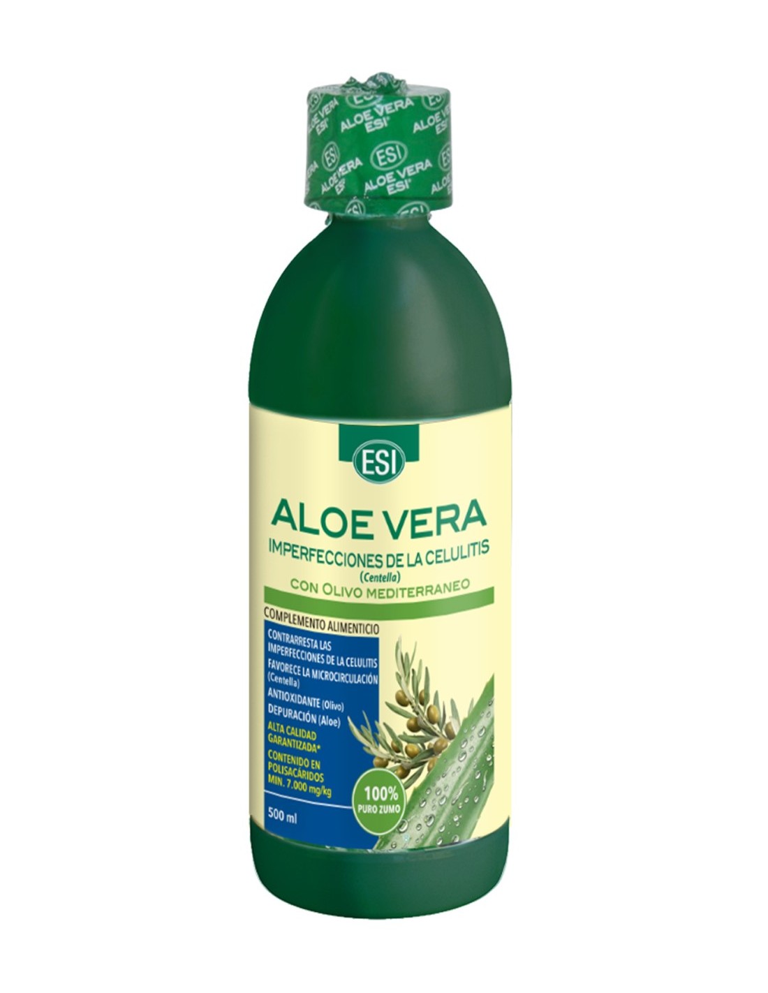 Aloe Vera (Aloe barbadensis Mill.) zumo estandarizado obtenido del gel sin piel; acidulante: ácido cítrico; aroma natural; Centella (Centella asiática L.Urb.) parte aérea extracto seco titulado 2% derivados triterpénicos como asiaticósidos; Olivo (Olea europaea L.) hoja extracto seco titulado 15% oleuropeína; conservantes: sorbato de potasio y benzoato de sodio.