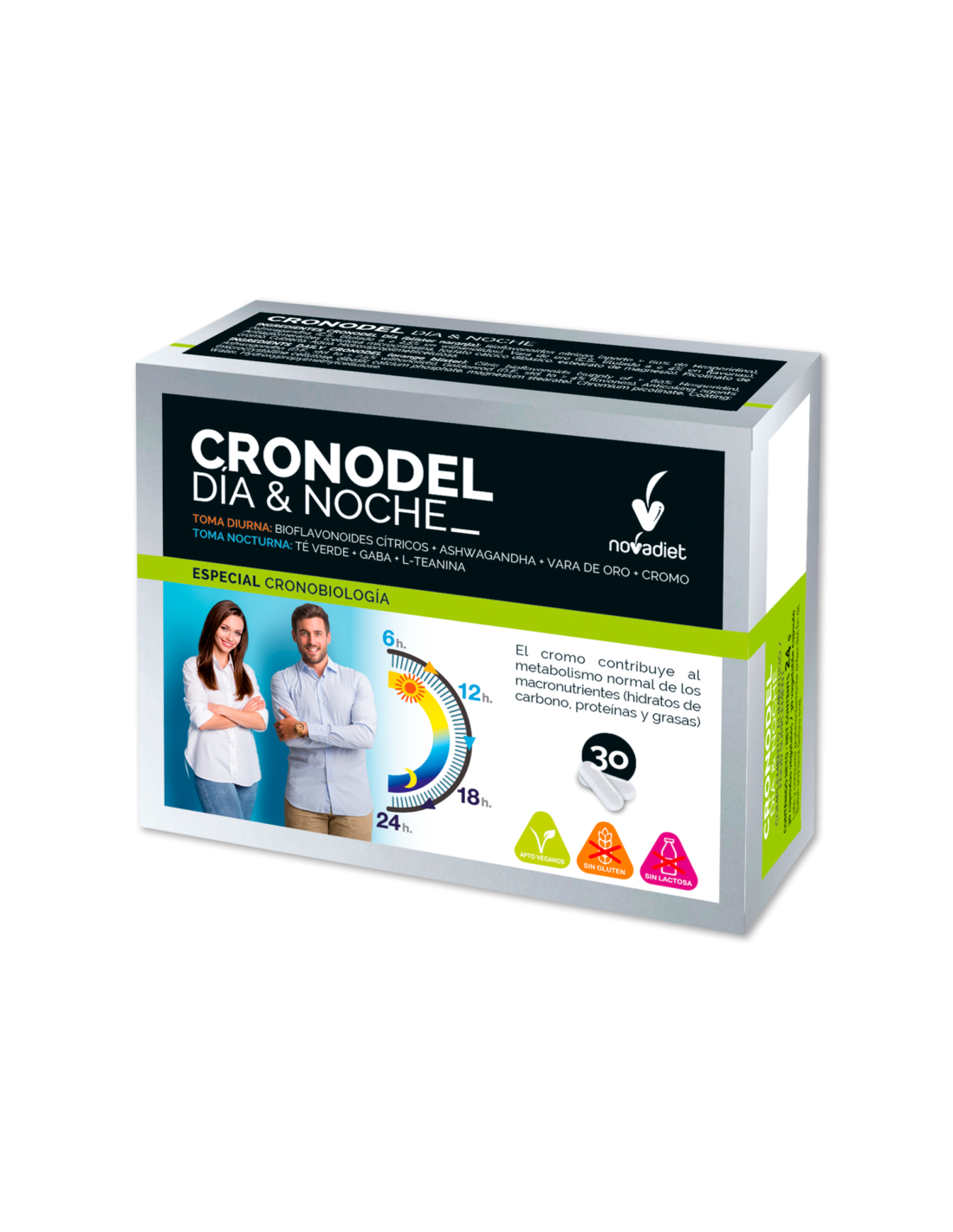 Tomar 1 cápsula Cronodel Día con el desayuno y 1 cápsula Cronodel Noche con la cena, con ayuda de agua. Dosis diaria recomendada: 2 cápsulas.