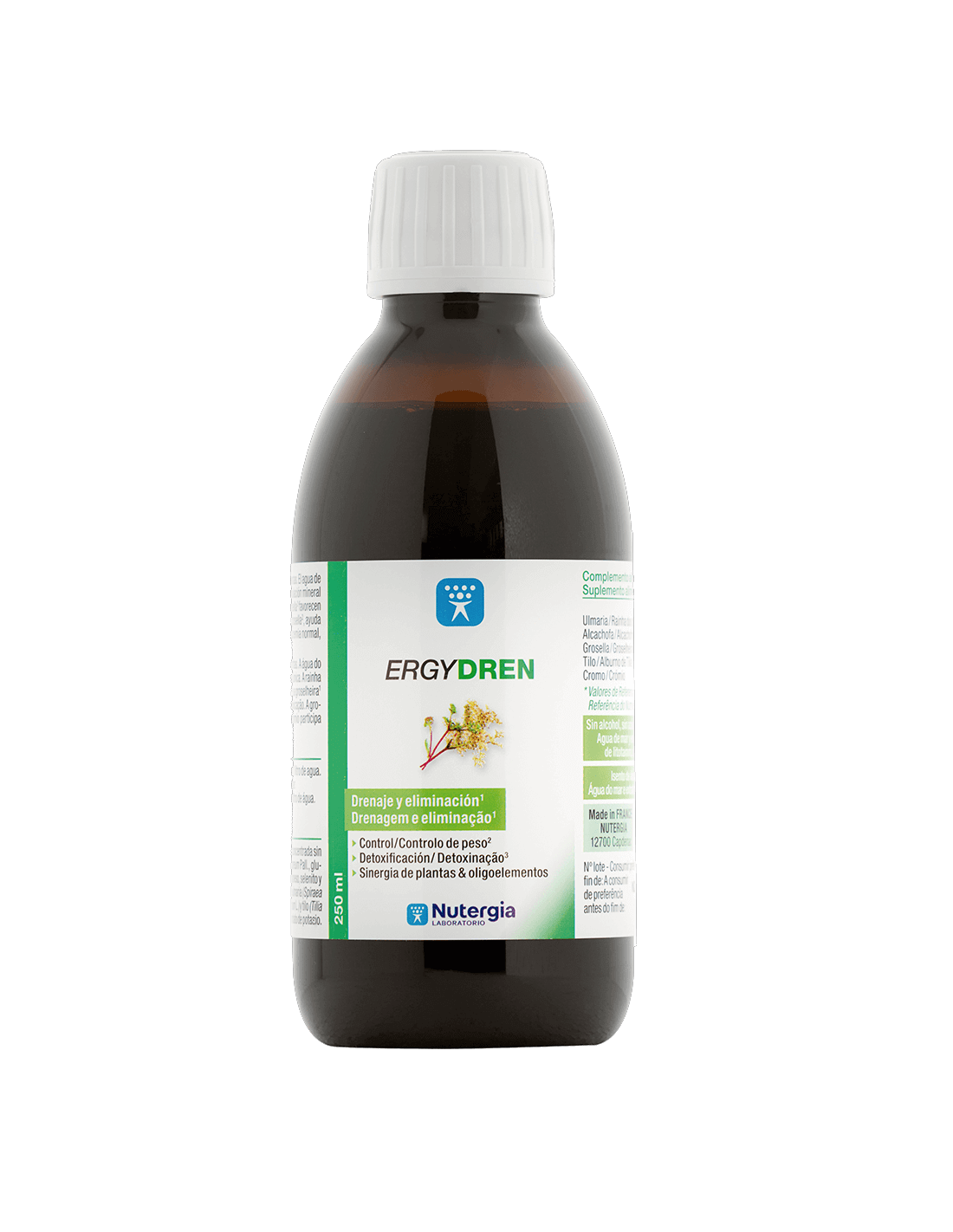 Solución acuosa de oligoelementos (agua filtrada, agua de mar concentrada sin sodio, extracto estandarizado de litotamno - Phymatolithon calcareum Pall., gluconatos de zinx, hierro y cobre, cloruro de cromo, sulfato de manganeso, selenito y molibdato de sodio), estabilizante: glicerina vegetal; extractos de ulmaria (Spiraea ulmaria L.), alcachofa (Cynara scolymus L.), grosella (Ribes nigrum L.) y tilo (Tilia cordata Mill.), aroma natural sabor melocotón, conservante: sorbato de potasio.