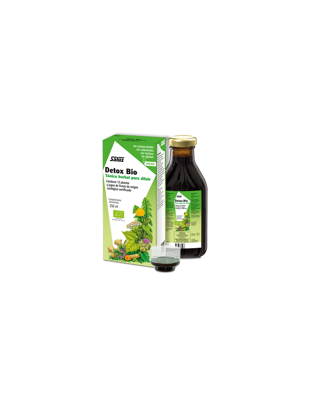 Extracto blando acuoso de higo bio y ciruela bio, extracto acuoso de plantas bio (36%) de: rizoma de cúrcuma bio, raíz de genciana bio, rizoma de jengibre bio, parte aérea de milenrama bio, hojas de diente de león bio, hojas de menta piperita bio, hojas de abedul bio, hojas de ortega bio, frutos de cardo mariano bio, hojas de romero bio. Agua, concentrado de jugo de saúco bio, concentrado de jugo de acerola bio (3%), extracto seco acuoso de té verde bio (1%), extracto seco acuoso de hojas de alcachofa bio (1%), aroma natural de vainilla.