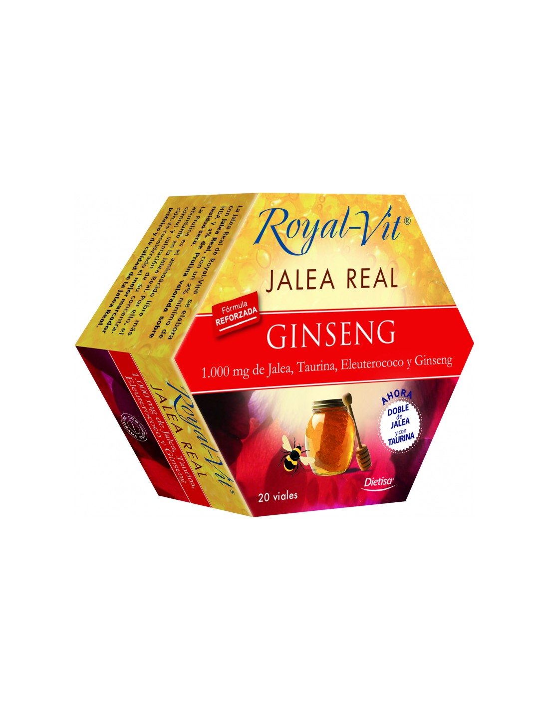 Por dosis diaria= 1 vial: Fructosa, agua, Jalea real: 1000 mg (con 1% de prolina valorada sobre residuo seco), taurina: 100 mg, extracto fluido de Eleuterococo (Eleutherococcus senticosus Maxim. (raíz)): 100 mg, acidulante: ác. cítrico, extracto seco de Ginseng 30% ginsenósidos, 12:1 (Panax ginseng C.A Meyer (raíz)): 43 mg, conservador: sorbato potásico, aroma.