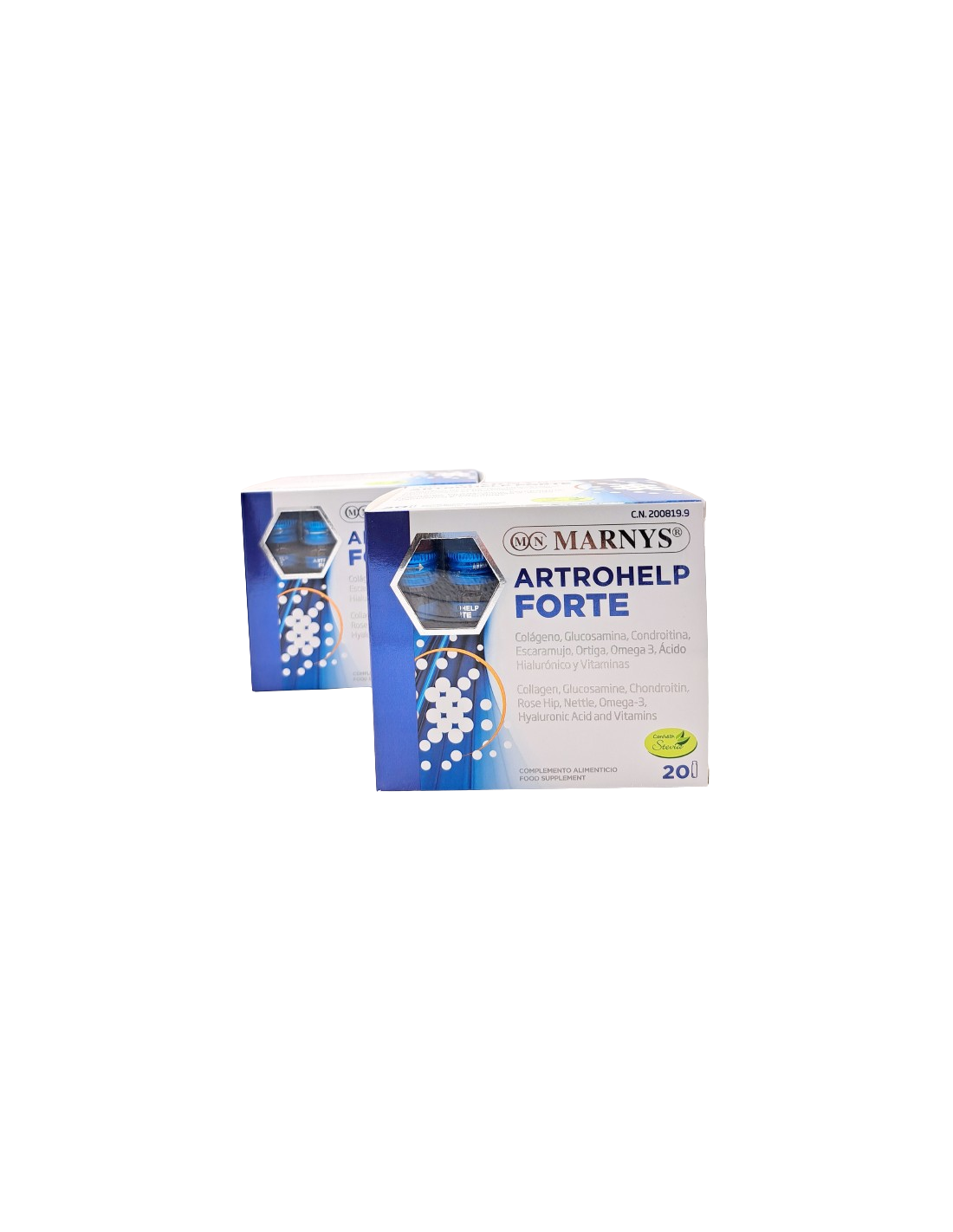 Agua desionizada, colágeno hidrolizado, sulfato de D-glucosamina, sulfato de condroitina, concentrado en polvo de escaramujo (Rosa canina), carbonato de calcio, concentrado de ortiga (Urtica dioica), aceite de pescado, ácido hialurónico, glicerina vegetal, D-α-tocoferol (vitamina E), menaquinona (vitamina K2), colecalciferol (vitamina D3), edulcorante (glucósidos de esteviol), conservador (sorbato potásico), aroma natural