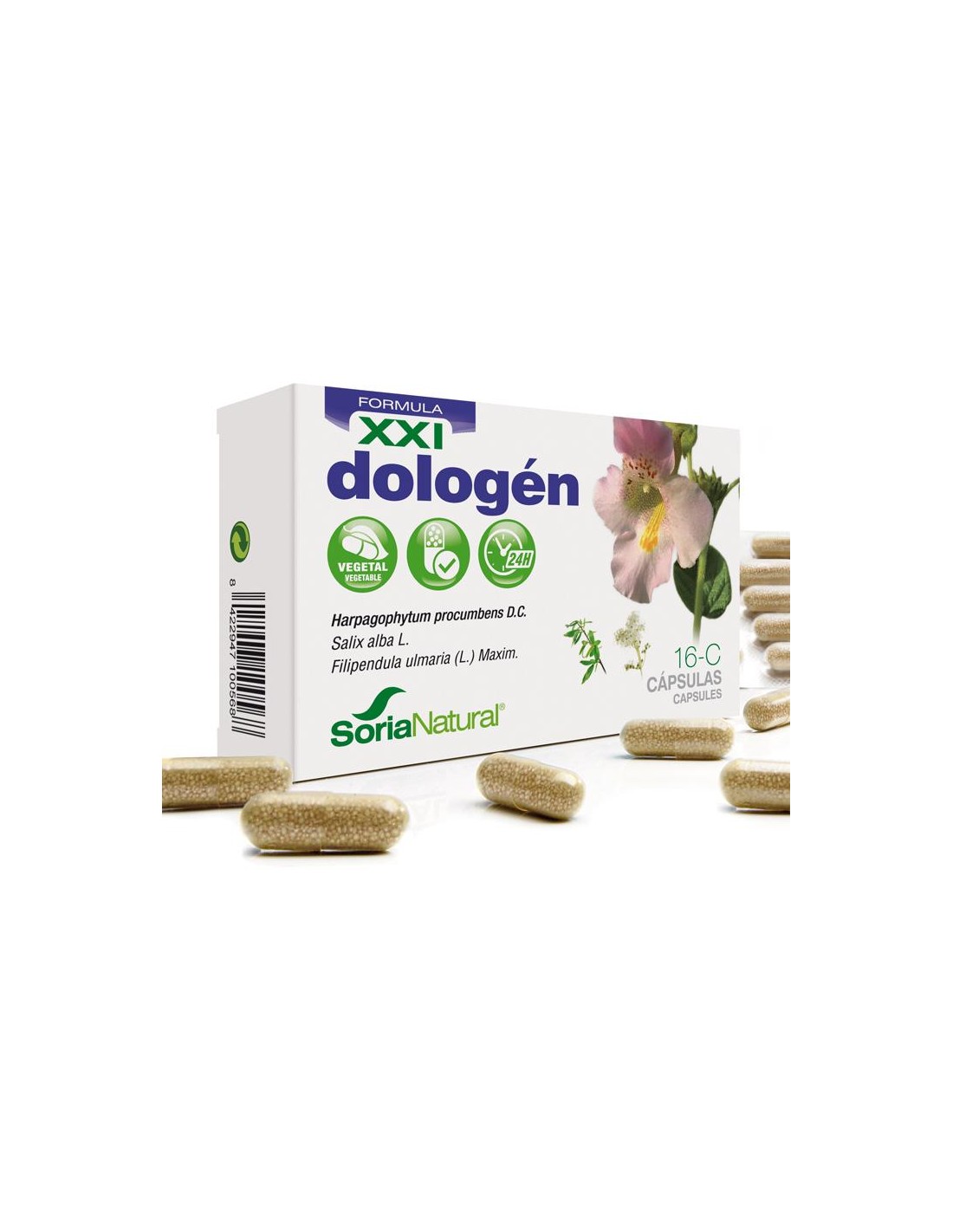 Estabilizante: celulosa microcristalina, extracto seco de harpagofito (Harpagophytum procumbens D.C., raíz)(150 mg), extracto seco de sauce (Salix alba L., corteza)(100 mg), extracto liofilizado de ulmaria (Filipendula ulmaria (L.) Maxim, sum. florida)(50 mg), agente de recubrimiento: copolímero de metacrilato neutro, cápsula (hidroxipropilmetilcelulosa).