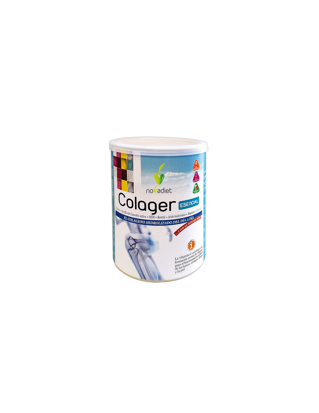 Colágeno hidrolizado, Citrato de magnesio, Maltodextrina, Acidulante (ácido cítrico), Aroma, MSM (metilsulfonilmetano), Semillas de Cannabis sativa, Bambú (E.S., titulado al 70% en sílice), Ácido hialurónico, Vitamina C (L-ascorbato cálcico), Edulcorante (sucralosa).