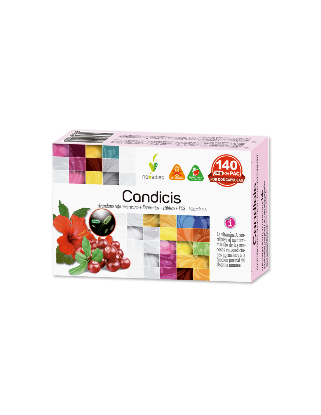 Hibisco, Arándano rojo americano [Vaccinium macrocarpon E.S., titulado al 50% en Proantocianidinas (PACs)], Fructooligosacáridos (FOS), Agente de carga (celulosa microcristalina), Fermentos (Lactobacillus rhamnosus, Lactobacillus reuteri) (leche), Antiaglomerantes (estearato de magnesio, dióxido de silicio), Vitamina A (acetato de retinilo).