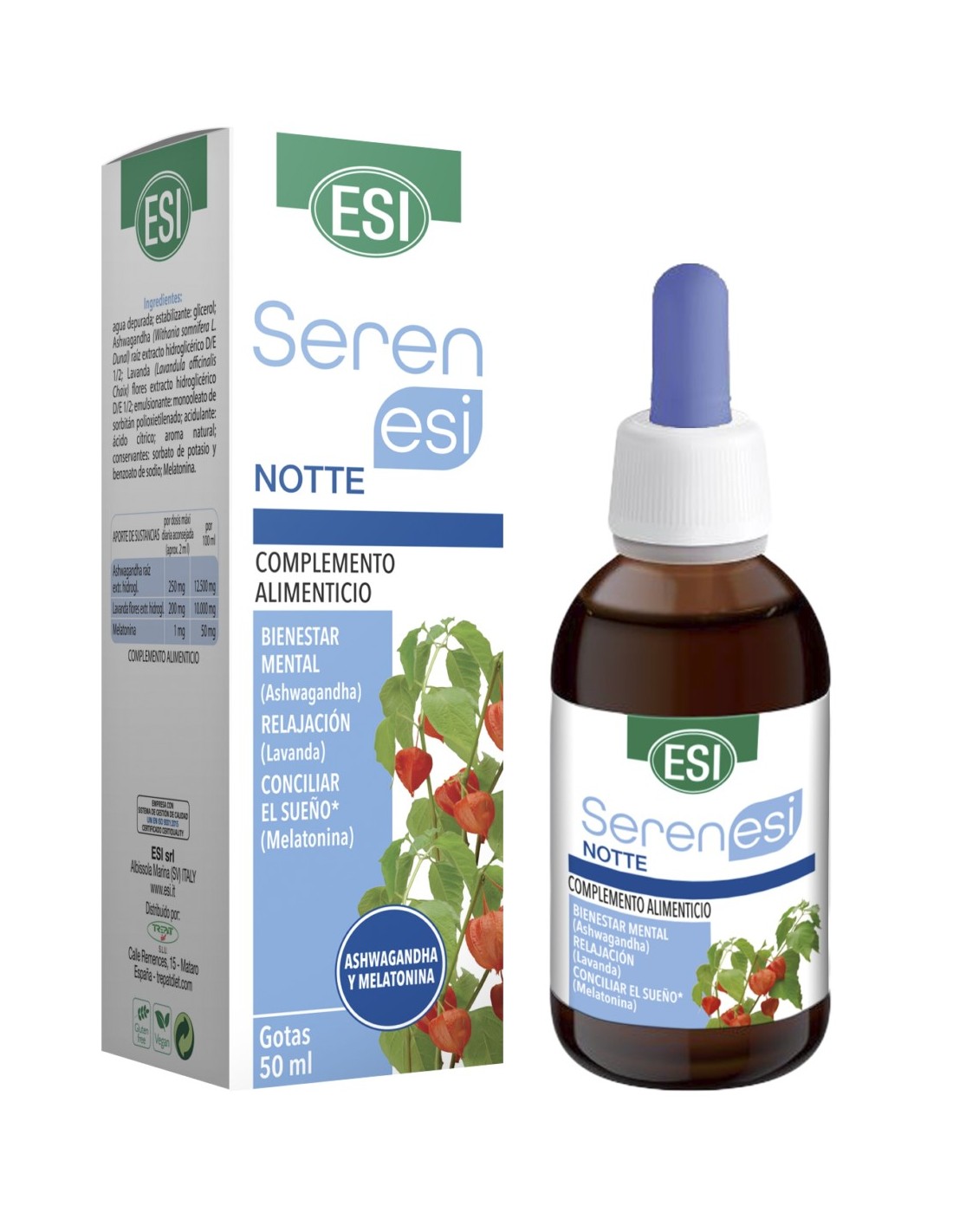 Agua depurada; estabilizante: glicerol; Ashwagandha (Withania somnifera L. Dunal) raíz extracto hidroglicérico D/E 1/2; Lavanda (Lavandula officinalis Chaix) flores extracto hidroglicérico D/E 1/2; emulsionante: monooleato de sorbitán polioxietilenado; acidulante: ácido cítrico; aroma natural; conservantes: sorbato de potasio y benzoato de sodio; Melatonina.